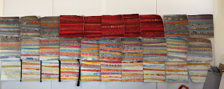 Then comes the time of silence. The quilt is simply too big for the design board. Pins will not hold it up and so I have to rely on memory and faith. This part is so hard. After the weeks of work and struggle I just have to trust that my concept for the art is good. The colors will work. The blocks will add to the quilt and the statement. Day after day I go into the studio and do the hand sewing until I have to find a different task. Now is the time for potholders and placemats. Something simple I can finish when I can't face another long seam. (Did I forget to mention that I hand finish all the bindings. Well of course I hope you realize.)